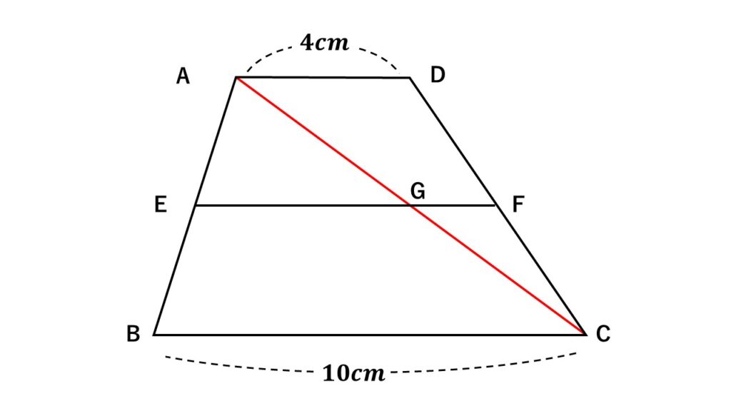 図は$AD//BC$の台形で、$AD=4cm$、$BC=10cm$とする。