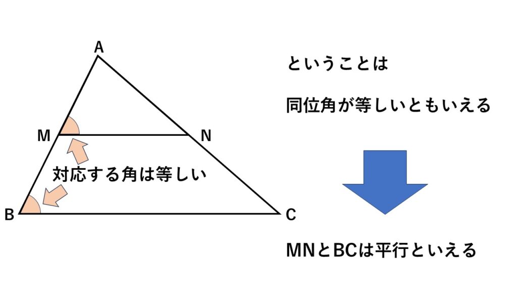 中点連結定理は図の$\triangle ABC$と$\triangle AMN$が相似であることから説明できます。
