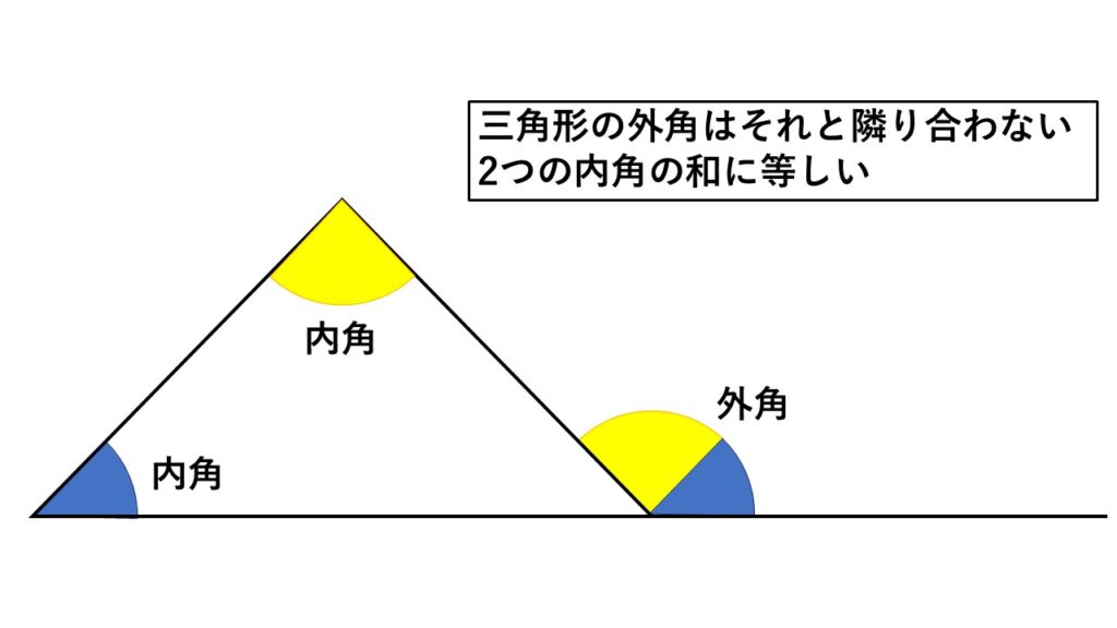 なお、三角形の1つの外角はそれと隣り合わない2つの内角の和に等しいことを使えば、
