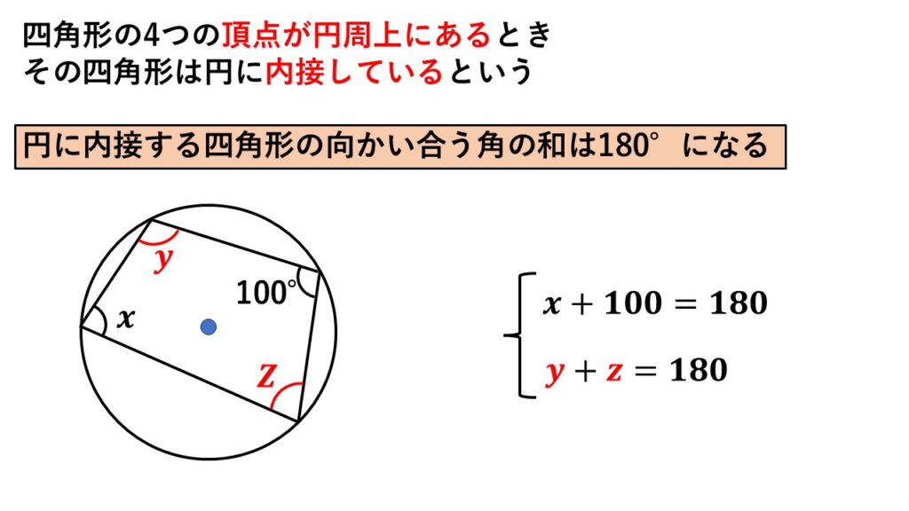 円に内接する四角形の向かい合う角を足すと、その結果は$180°$になります。