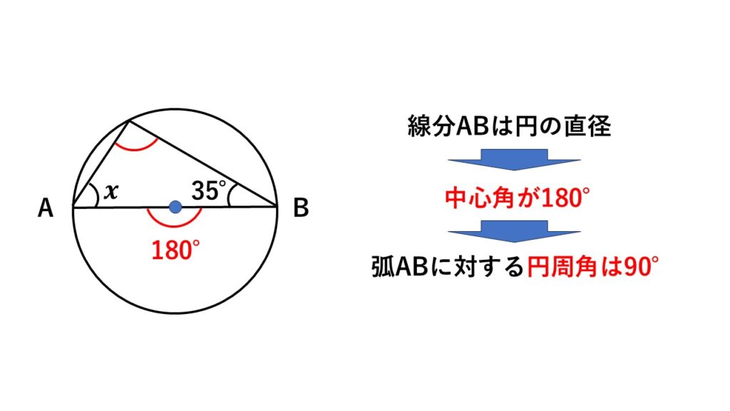 このとき弧$AB$に対する中心角は$180°$です。