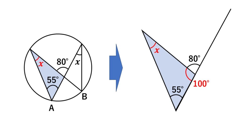 $80=x+55$より$25°$が求まります。