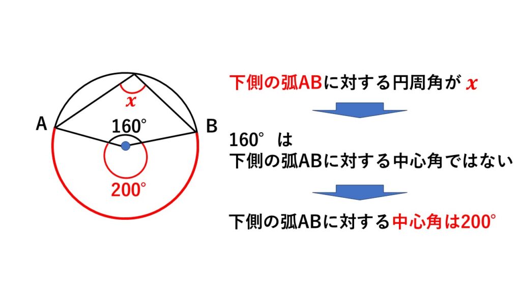求める$x$は下側の弧$AB$に対する円周角。よって$160°$は下側の弧の中心角ではありません。