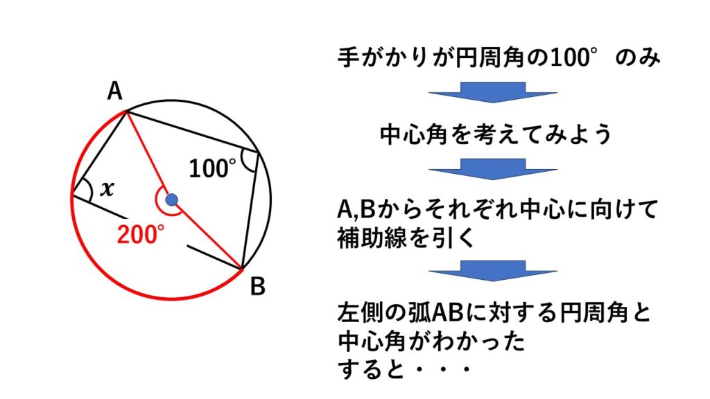弧$AB$に対する円周角と中心角を、別の視点から表わせるように1本補助線を引くのがポイント。