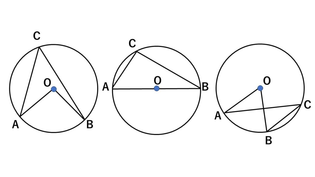 円周角の定理を3パターンに分けて証明しましたが、どのパターンでも弧$AB$に対する円周角と中心角を考えていることに気づいてください。