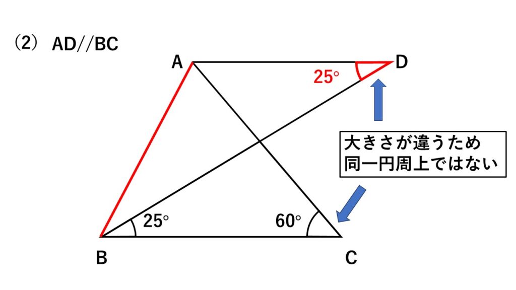 $\quad\angle ACB$と大きさが異なるため同一円周上ではないといえます。
