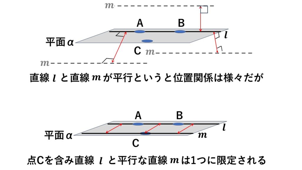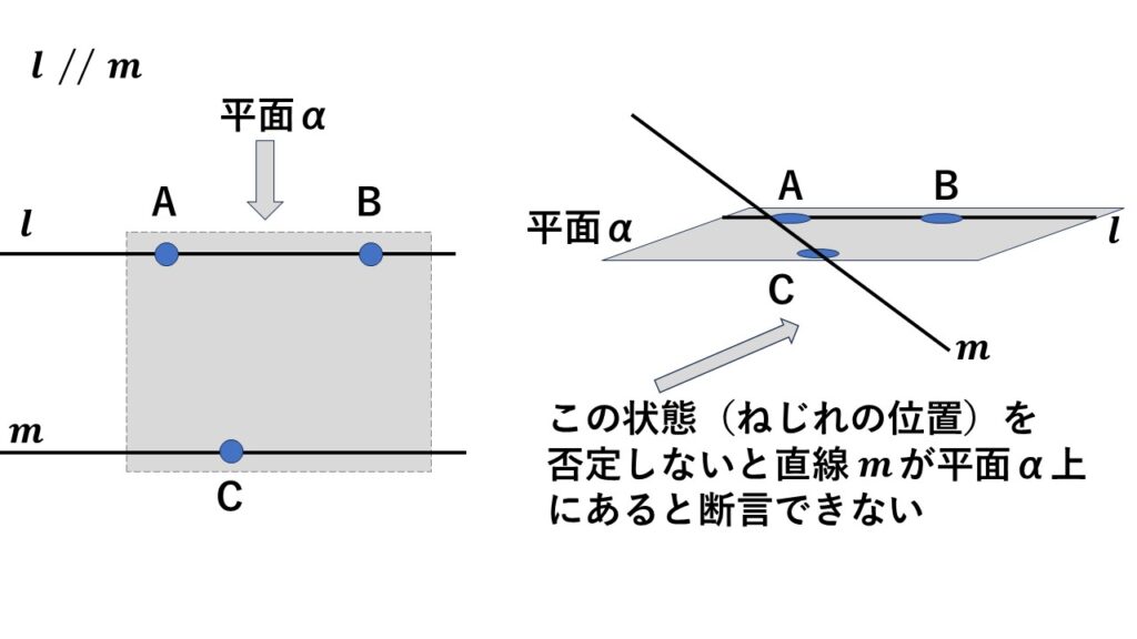 平面$\alpha\:$を上から見たら直線$l\:$と直線$m\:$は平行に見えても、平面$\alpha\:$を真横から見たら斜めに走っていることも考えられます。