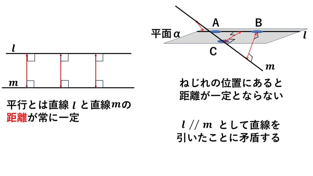 元々直線$l\:$と直線$m\:$は平行に引いたので、空間においても、ねじれの位置にあると矛盾してしまいます。
