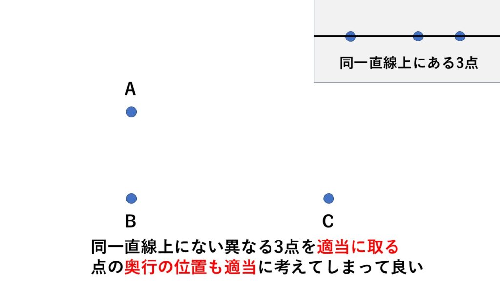 ただ、同一直線上にある3点を考えた場合、単に1つの直線を考えただけになってしまうので、平面の決定ができなくなります。