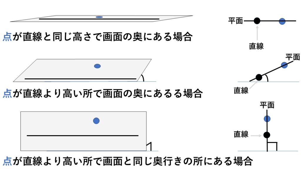 このとき、直線から見てどの空間に点を取るかによって、できる平面の広がる向き(平面の傾き方)が変わってきます。