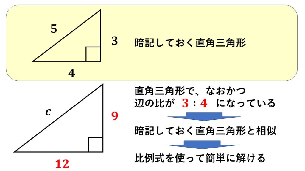 ですが、暗記しておくと良い三角形の辺の比の関係に気づければ、$\:a^2+b^2=c^2\:$の計算をしなくても相似の関係から瞬時に解答できます。