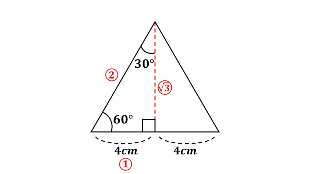 このときできる2つの三角形は、垂線によりできる$90°$と底角が$60°$から残りの角が$30°$の直角三角形となる